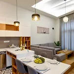 客房提供咖啡机,厨房和沙发为客人的方便.